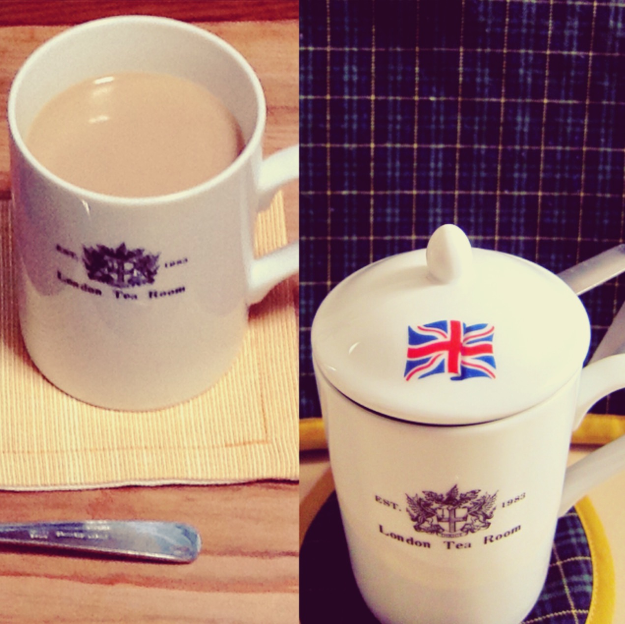 筆者は、国旗とエンブレムがあしらわれたロンドンティールームのティーマグを使っています。