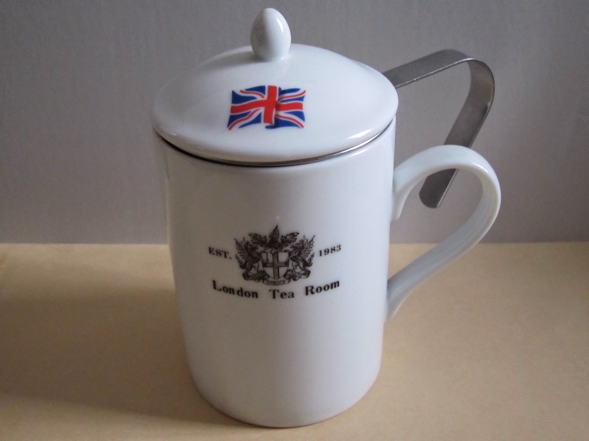 筆者が使っているのは、マグ本体にロンドン市の紋章と「London Tea Room」の刻印、蓋にイギリス国旗がプリントされています。