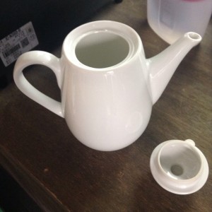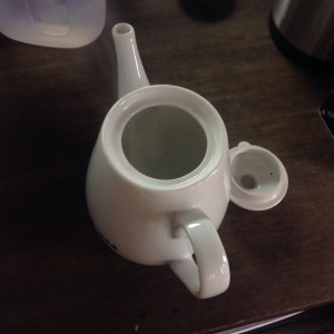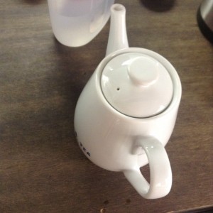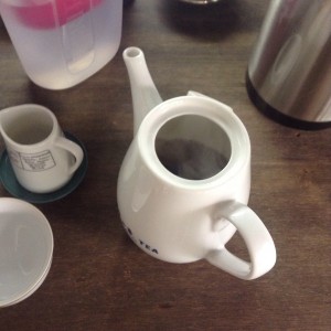 このポットの注ぎ口の下のあたりが、ティーカップ三杯分のお湯の量になるので、そのあたりまで、お湯を入れます。