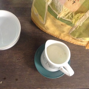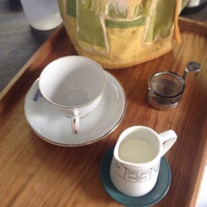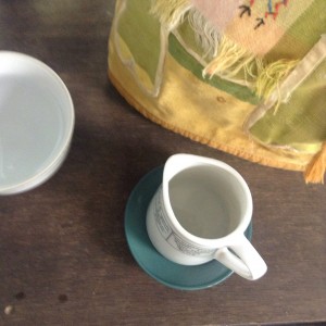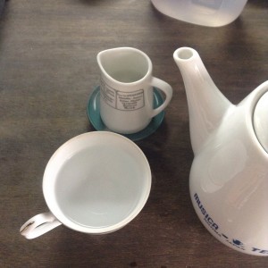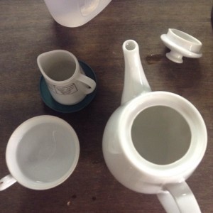 しばらくしてポットが暖まったら、ポットのお湯をティーカップとミルクジャグに注いで温めます。