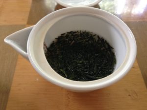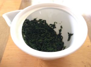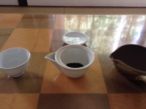 かぶせ茶を宝瓶に入れて、小さな湯飲みと湯冷ましを準備して。