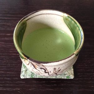 お抹茶の粉を漉さず、水で溶いて、お湯を注いで、茶筅で点てて。とした。