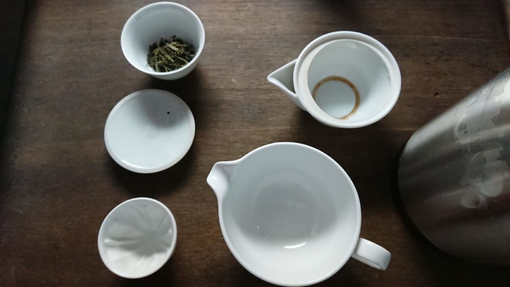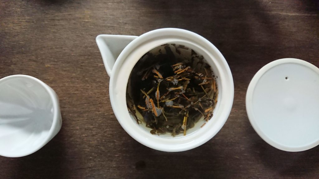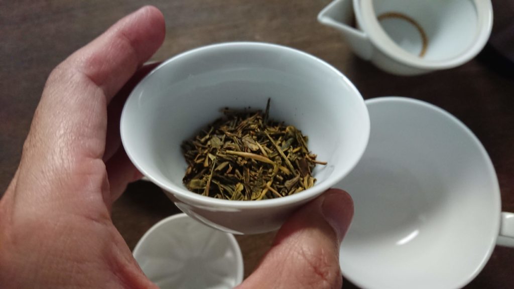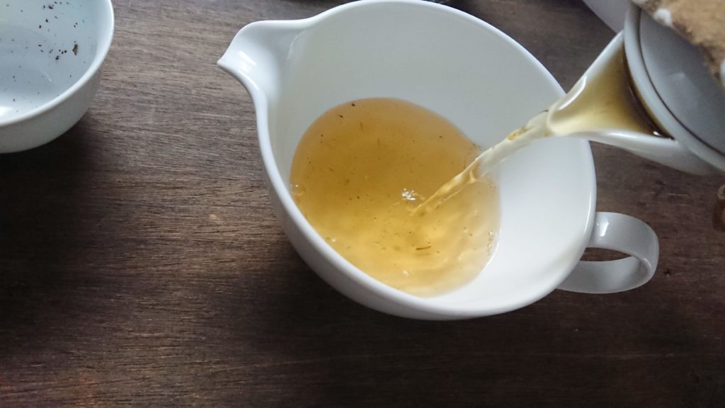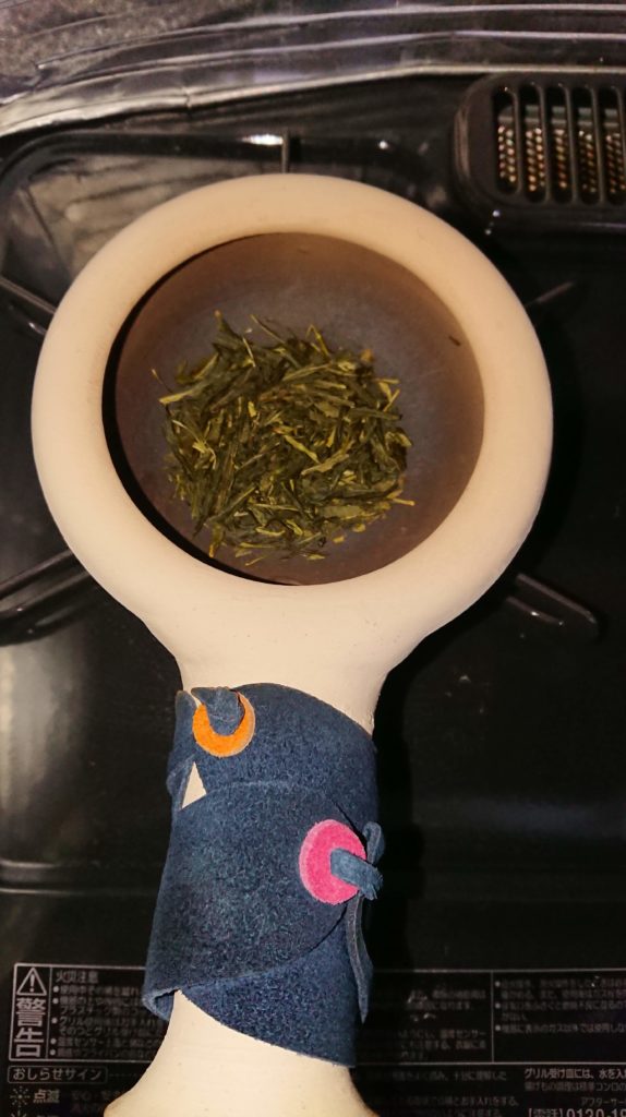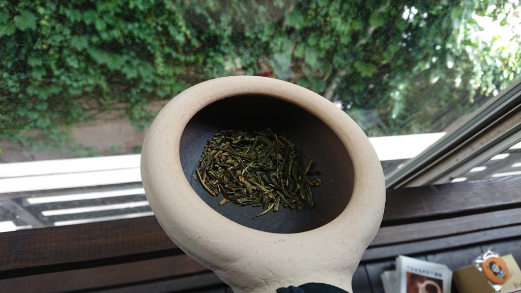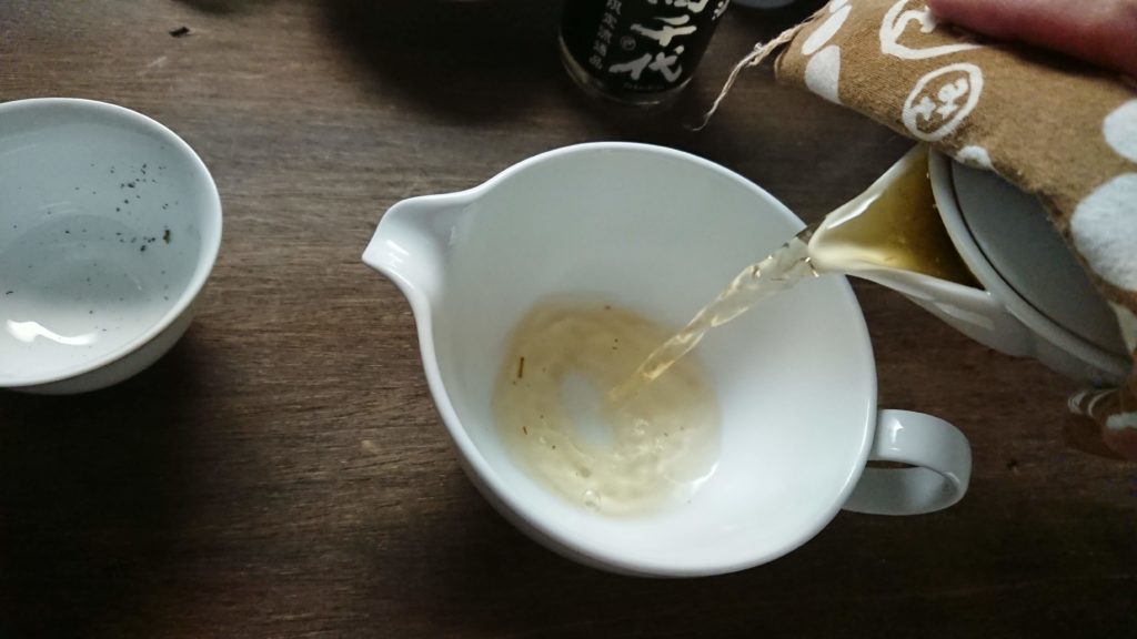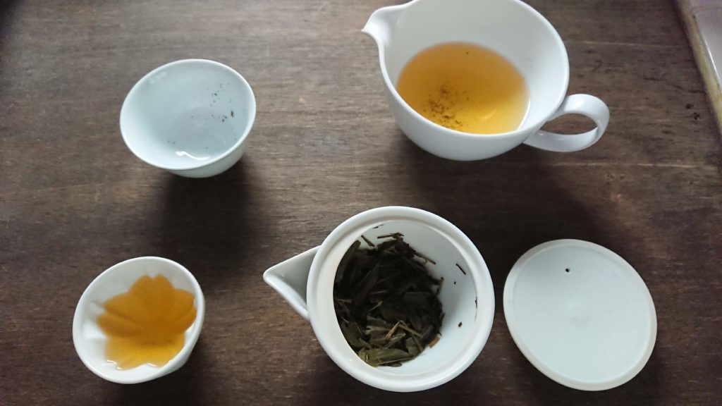 炒る前の元の荒茶も淹れて、飲み比べ。お腹が減ったので、巻き寿司と一緒に試飲。巻き寿司を食べながら飲むときは、ほうじ茶の方が好み。食べ終えて、口直しするときは緑色の荒茶の方が好み。