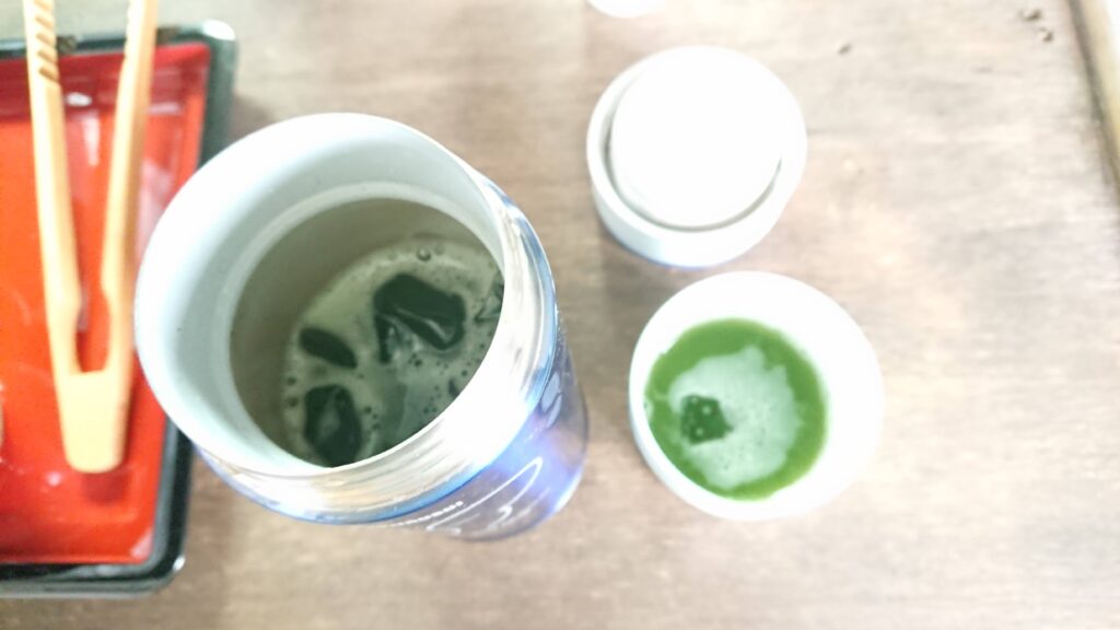 保温性の高い水筒に氷、抹茶、水を入れて振ったのですー