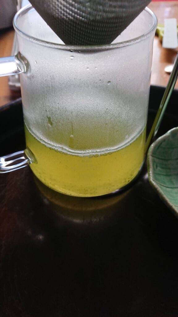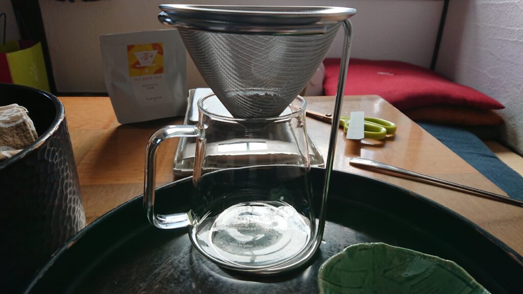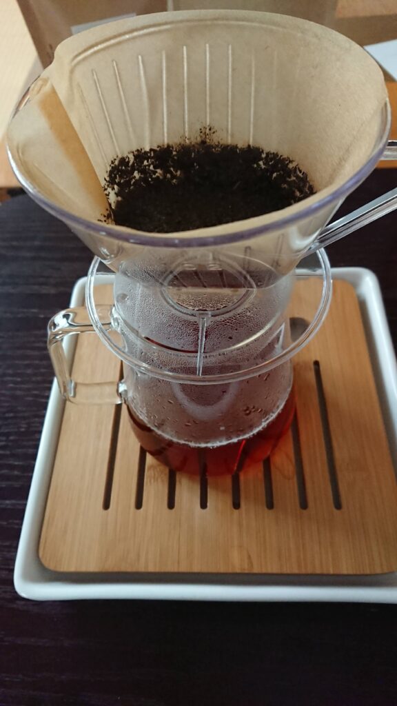 ポットにお湯を入れて、コーヒーのドリップをするように少しお茶っ葉を湿らせた後、お湯をゆっくりドリッパーに注ぎました。