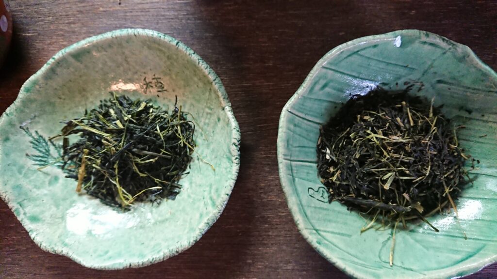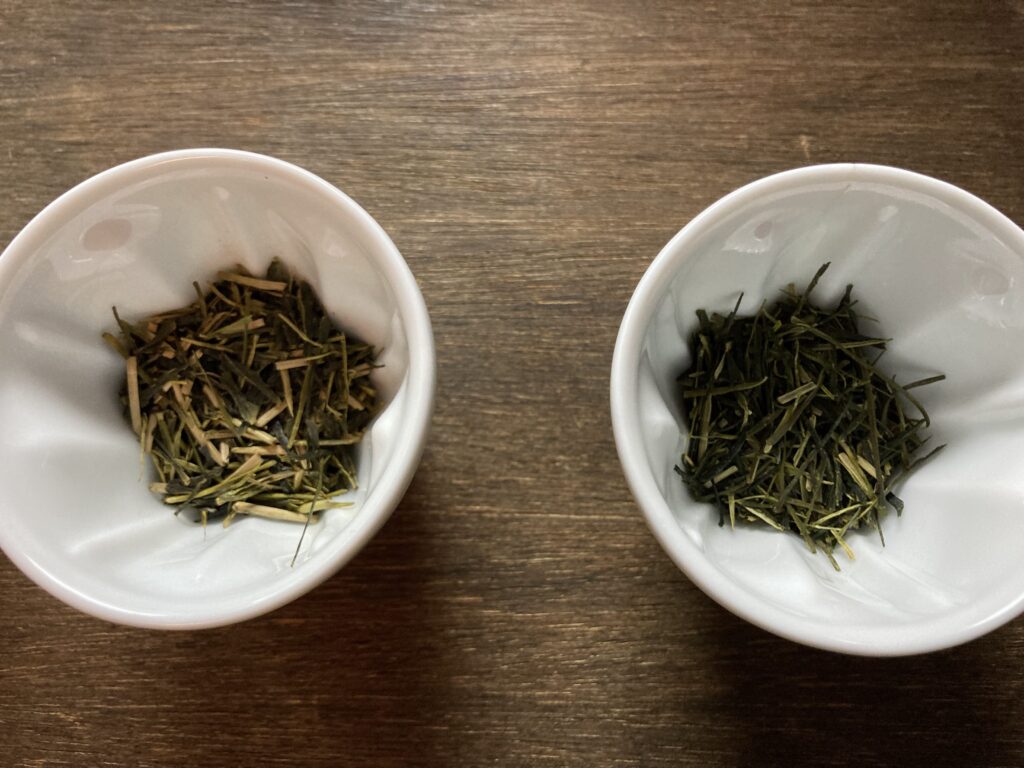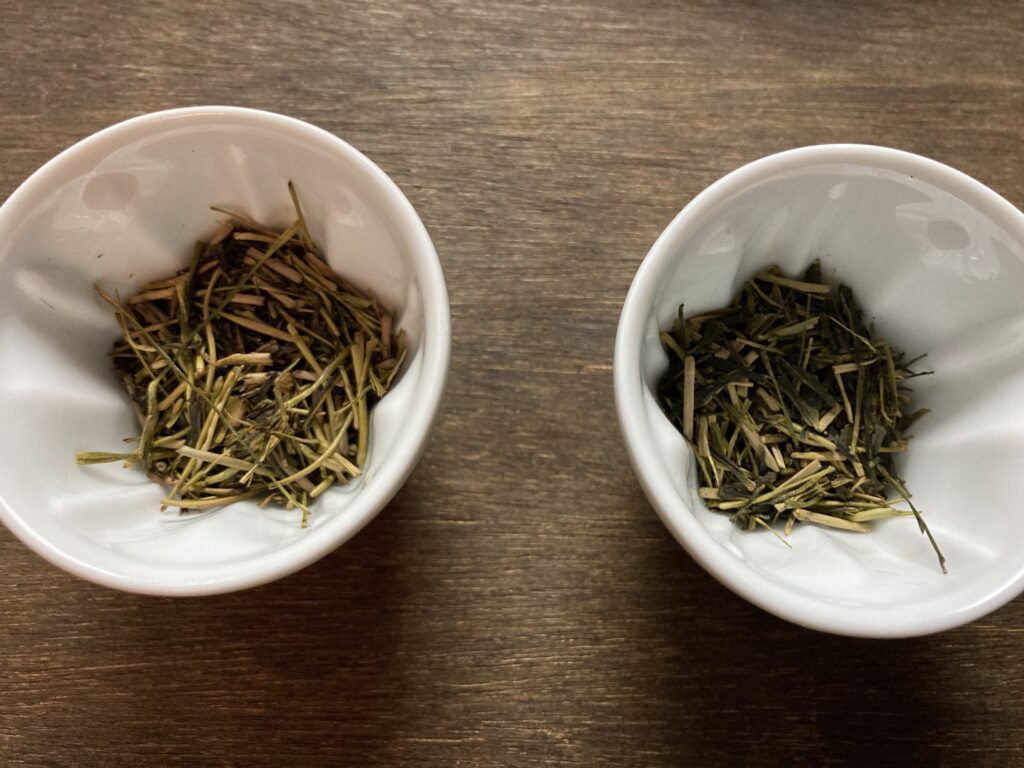 左:焙じ加減弱め、右:焙じる前の茎茶。