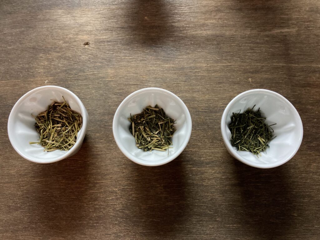 左から、焙じ加減強め、弱め、焙じる前の茎茶。