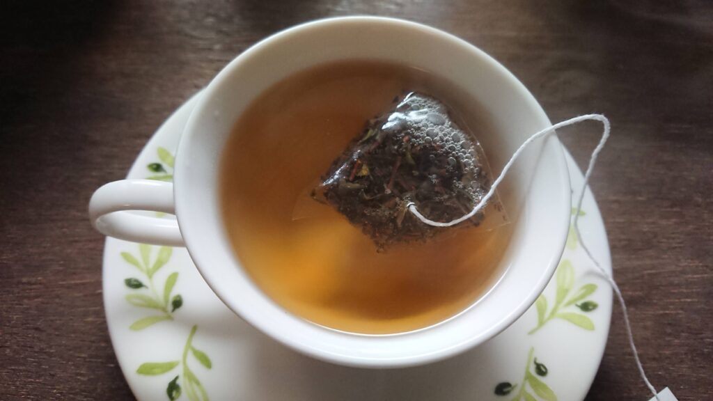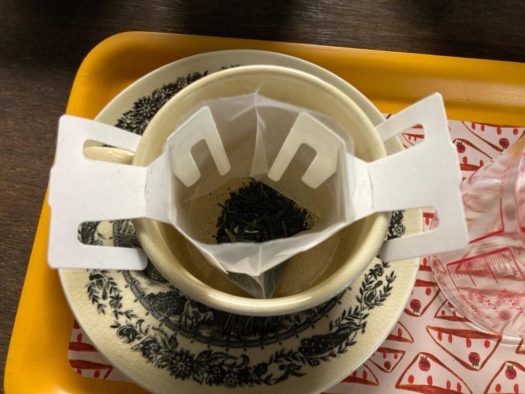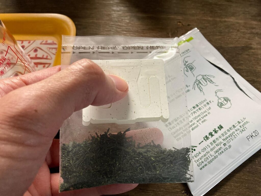 紙コップにお湯が注がれていて、大きな形状の茶葉が入ったTB(ティーバッグ)をそろりと入れる。